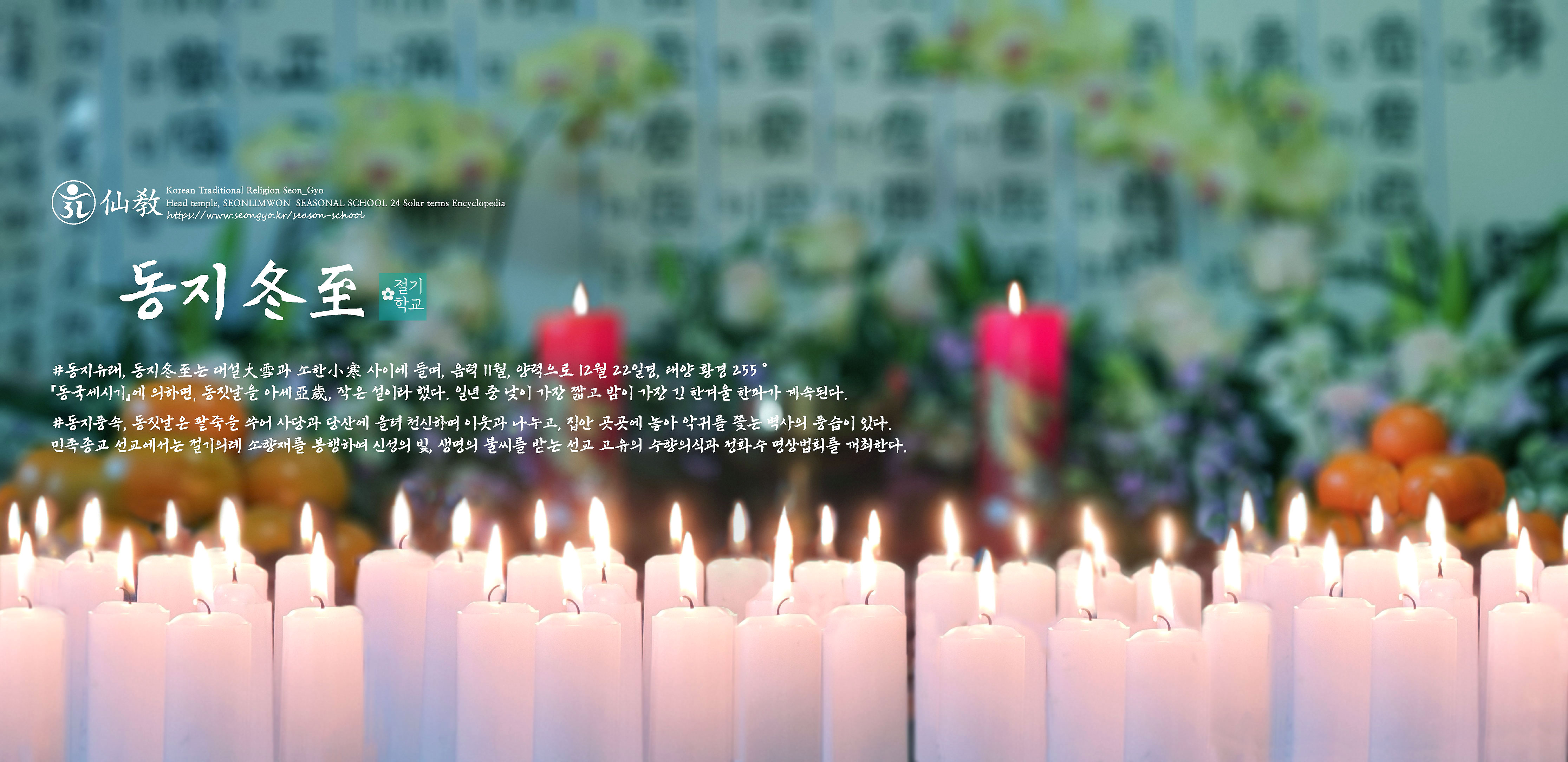 민족종교 선교(仙敎)에서는 12월 1일부터 21일까지 삼칠일동안 선교정회력(仙敎正回曆)을 근간으로 일년간의 수행을 되돌아보며 포성기도(布省祈禱)를 올립니다. 포성기도는 선교 교단의 고유한 의례로 선교인(仙敎人) 모두 정화수기도를 올리며 재계(齋戒)와 정회(正回)의 시간을 갖습니다. 선교총림 선림원은 선교 수행대중의 포성기도를 주관하며 포성기도 회향과 함께 선교 5대향재 중 동지향재인 “소향재(素嚮齋)”를 봉행합니다. 동지 소향재는 환인 하느님으로부터 신성(神性)의 불씨를 교유받는 선교 창교주 취정원사님의 수향의식과 동지수훈(冬至垂訓), 선교총림 시정원주님의 정화수기도 명상법회 및 동지절기음식 팥죽과 팥시루떡 새해 달력 나눔 등의 대중포선으로 진행됩니다. _ 민족종교 선교총본산 선교총림선림원