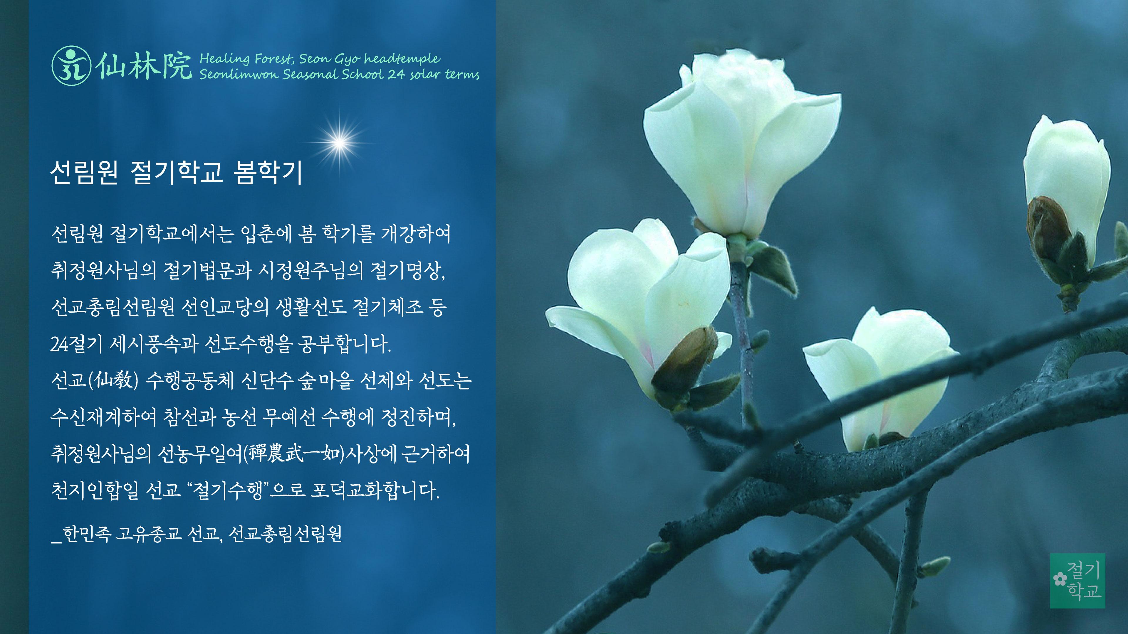 지난 2007년부터 선교종단 정기간행물 [仙敎]誌 발행을 통해 “24절기 선도수행”과 “선교 문화”에 대한 대중의 이해와 참여를 이끌어 온 선교 교단 재단법인 선교(仙敎)와 산하 선교총림 선림원(仙林院)은 창교 35주년을 맞는 2026년 병오년 입춘 절기를 기점으로,「절기문화원(節氣文化院)」의 전국지부를 개설하여 24절기 세시풍속과 선교 수행문화 선도(仙道)에 대한 본격적인 대중교화를 실시합니다. 선교총본산 선교총림 선림원은 2026년 입춘 절기법회에서 2026년 24절기 달력과 춘축(春祝,춘첩자)을 배포하고, 입춘 절기식(立春節食) 오신채(五辛菜,五辛盤,細生菜)를 이웃종교와 수행대중에 나눔 하였습니다.